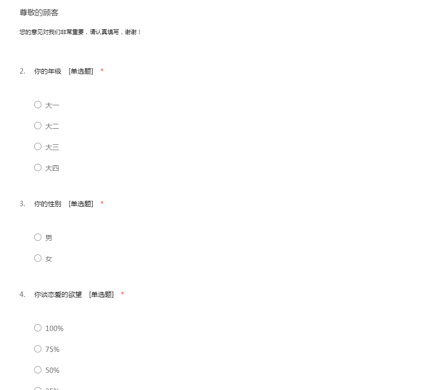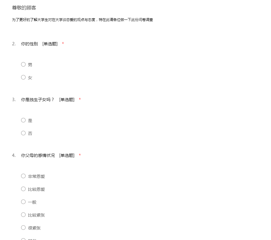 亲爱的同学:你好!为了更好地了解大家的恋爱观及恋爱状况,为大家现在或以后可能遇到的问题提供帮助,我们特设计此问卷。问卷所用数据均用于统计分析且为匿名调查,我们会保护你的隐私权,望如实回答。非常感谢你的支持。