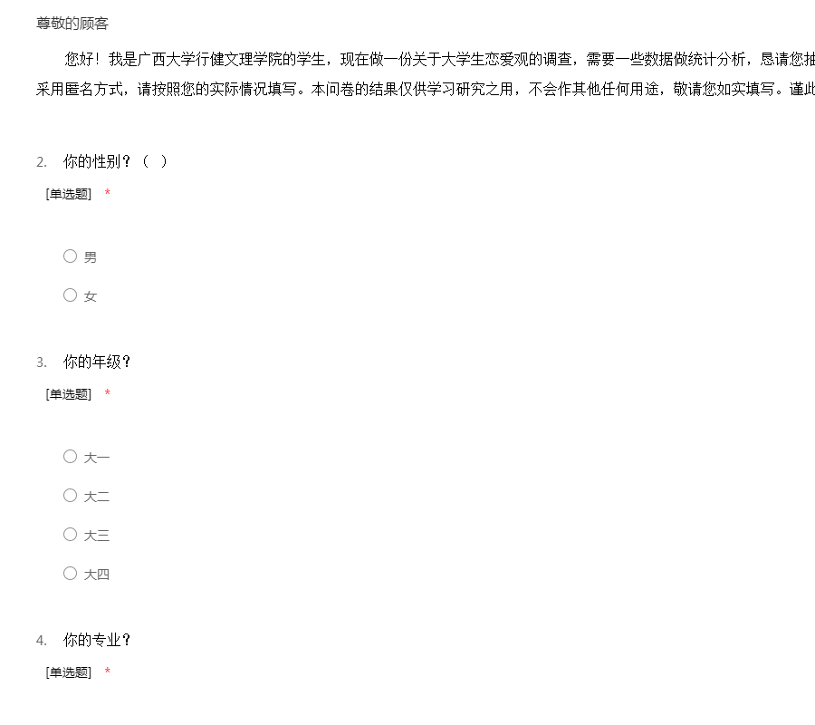 您好!我是广西大学行健文理学院的学生,现在做一份关于大学生恋爱观的调查,需要一些数据做统计分析,恳请您抽出几分钟宝贵的时间填写。本问卷采用匿名方式,请按照您的实际情况填写。本问卷的结果仅供学习研究之用,不会作其他任何用途,敬请您如实填写。谨此至上最诚挚的感谢!