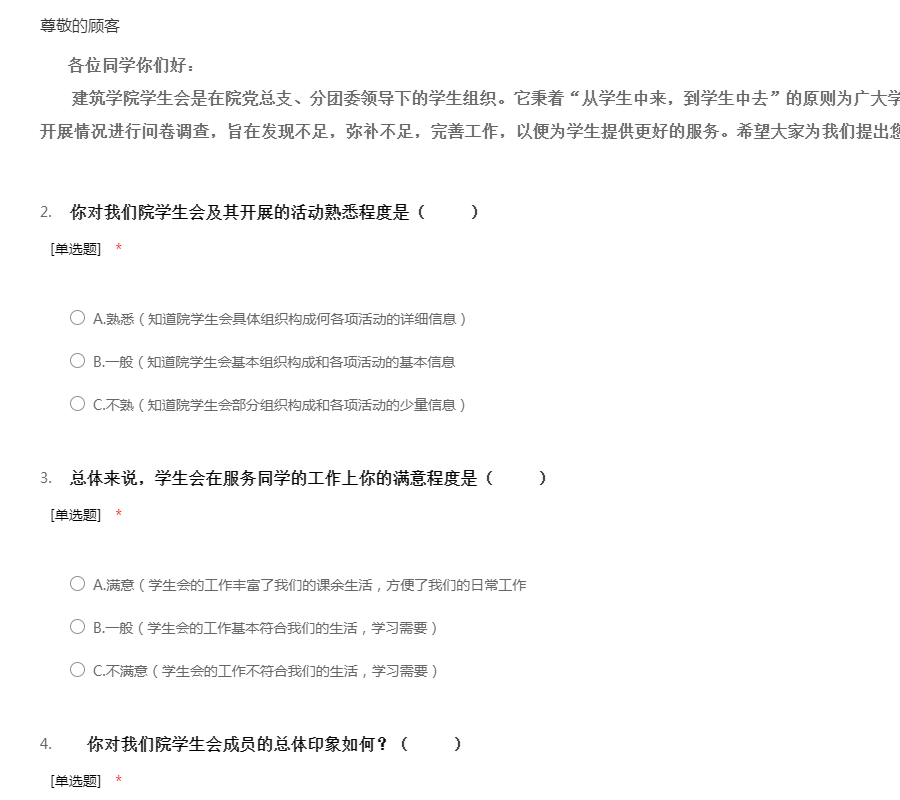 各位同学你们好:建筑学院学生会是在院党总支、分团委领导下的学生组织。它秉着“从学生中来,到学生中去”的原则为广大学生服务。现对我院学生会的工作开展情况进行问卷调查,旨在发现不足,弥补不足,完善工作,以便为学生提供更好的服务。希望大家为我们提出您衷心的意见和建议,谢谢!