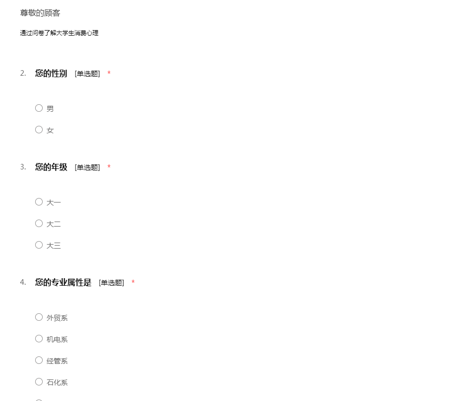 您好!非常感谢您在百忙之中填写这份问卷,我们调查的目的是想了解目前大学生消费行为现状。本问卷不用于任何商业用途,各项答案无所谓好坏对错,请您依据自己的看法填写。 谢谢你的合作!