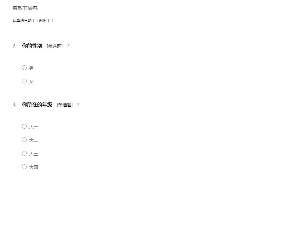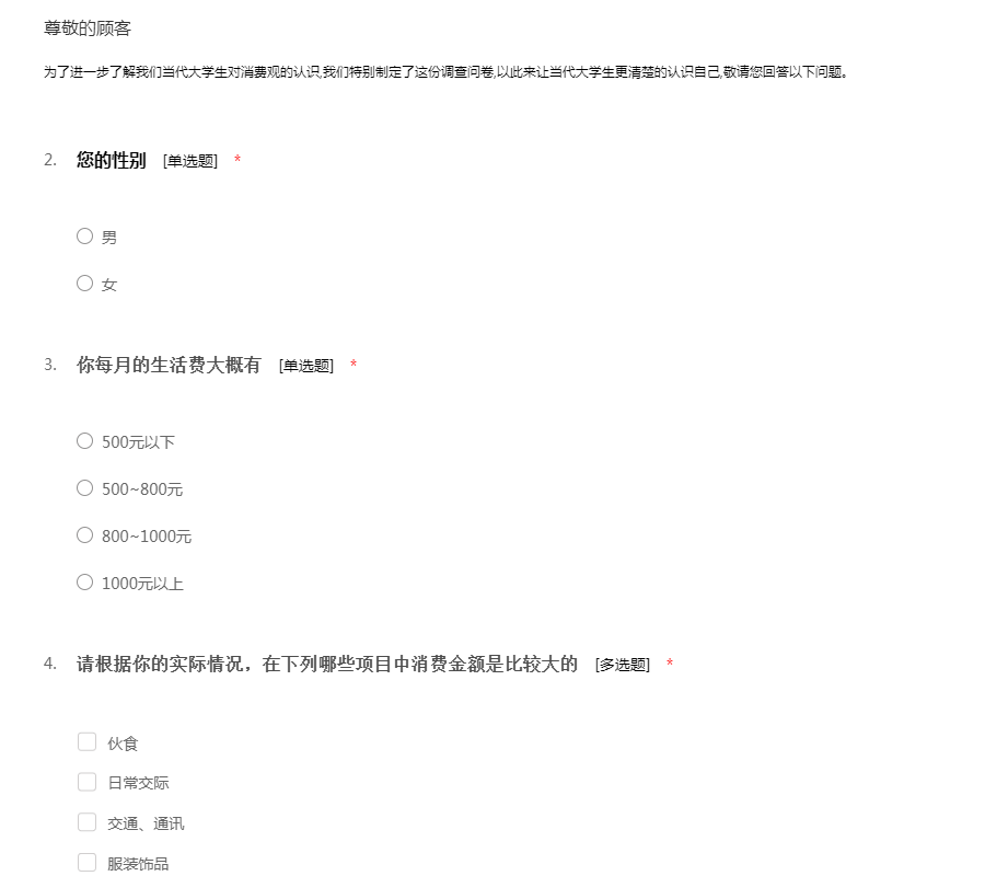 亲爱的同学:您好!首先感谢您在百忙中抽出时间来参与此次问卷调查!大学生是一个庞大而特殊的消费群体,近年来,大学生的消费状况也越来越受到关注。对于大学生的消费状况研究有利于研究整个中国社会的消费状况,特此,我们研究设计了此次问卷调查,希望您能如实的填写。您所做的一切内容我们将严格保密,绝不外泄。谢谢合作!