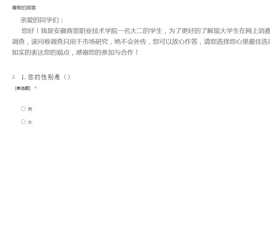 亲爱的同学们: 您好!我是安徽商贸职业技术学院一名大二的学生,为了更好的了解现大学生在网上消费的具体数据,特做次问卷调查,该问卷调查只用于市场研究,绝不会外传,您可以放心作答,请您选择您心里最佳选项,恳请您在百忙之中认真如实的表达您的观点,感谢您的参加与合作!