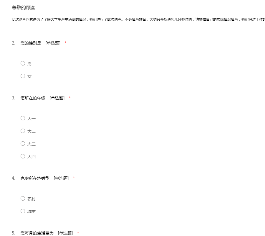 此次调查问卷是为了了解大学生追星消费的情况,我们进行了此次调查。不必填写姓名,大约只会耽误您几分钟时间,请根据自己的实际情况填写,我们将对于你的回答进行保密。衷心感谢您的支持与合作!