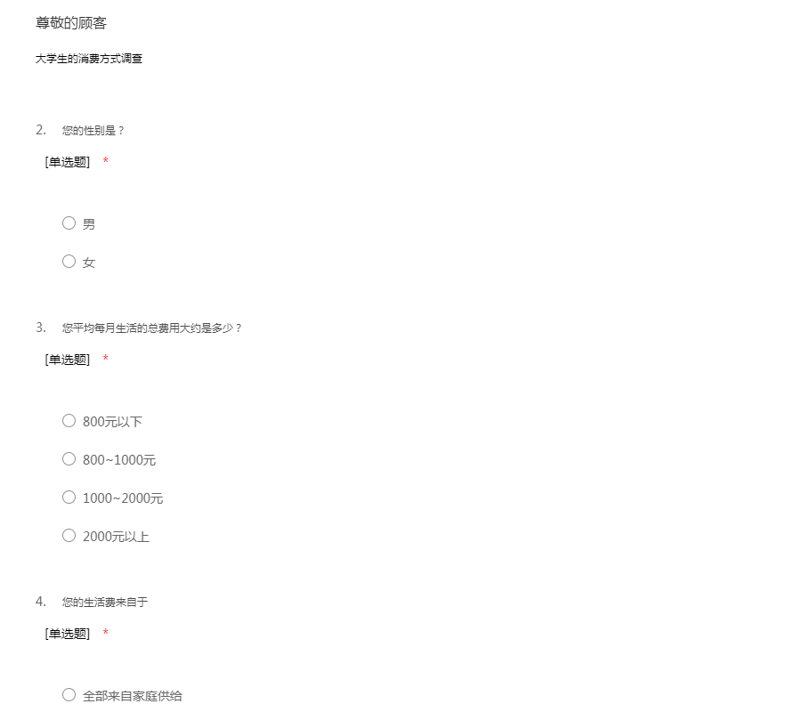 您好!非常感谢您在百忙之中填写这份问卷,我们调查的目的是想了解目前大学生消费行为现状。本问卷不用于任何商业用途,各项答案无所谓好坏对错,请您依据自己的看法填写。 谢谢你的合作!