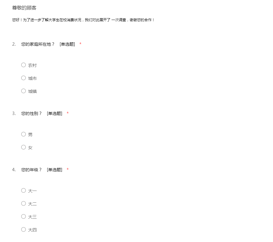 亲爱的同学,您好!在经济高速发展的今天,大学生作为一个特殊的消费群体正受到越来越大的关注。为了更好的了解当今大学生的消费状况,特做此调查活动,望您在百忙之中完成此份问卷。真诚感谢您的参与!(本次活动调查结果不用做任何商业用途,只为完成课程作业,请放心填写。)