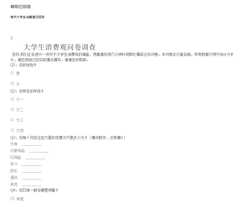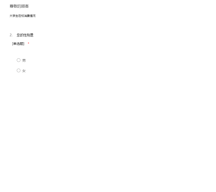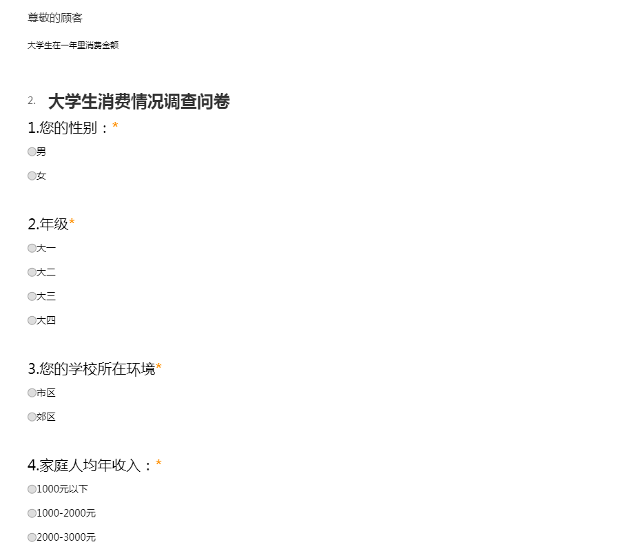 亲爱的同学,您好!在经济高速发展的今天,大学生作为一个特殊的消费群体正受到越来越大的关注。为了更好的了解当今大学生的消费状况,特做此调查活动,望您在百忙之中完成此份问卷。真诚感谢您的参与!(本次活动调查结果不用做任何商业用途,只为完成课程作业,请放心填写。)