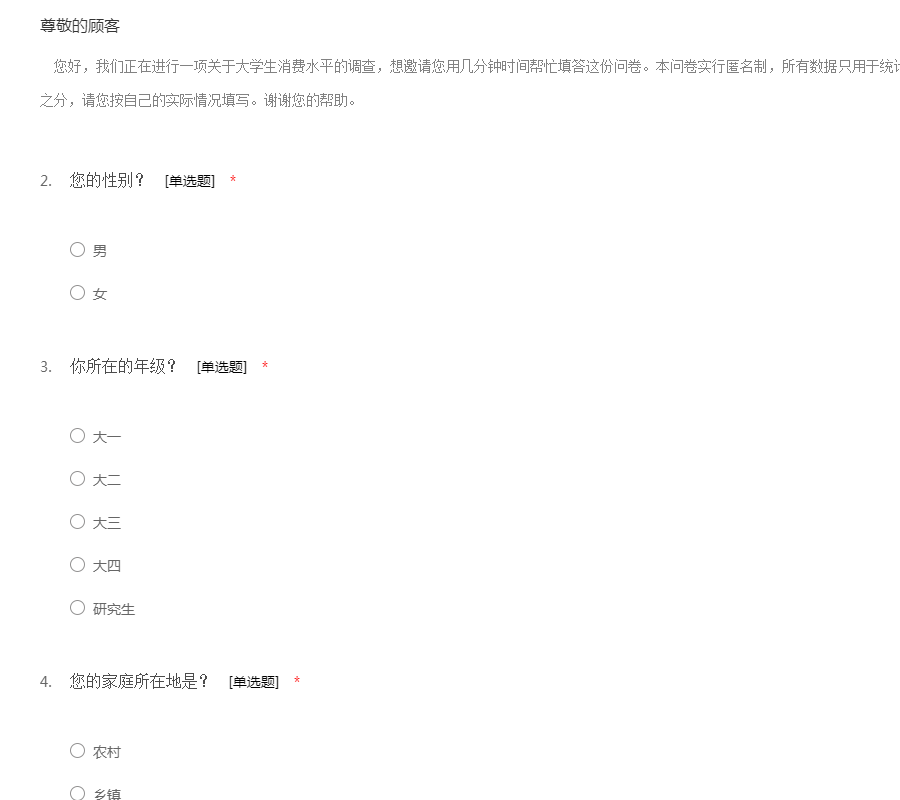 您好,我们正在进行一项关于大学生消费水平的调查,想邀请您用几分钟时间帮忙填答这份问卷。本问卷实行匿名制,所有数据只用于统计分析, 请您放心填写。题目选项无对错之分,请您按自己的实际情况填写。谢谢您的帮助。