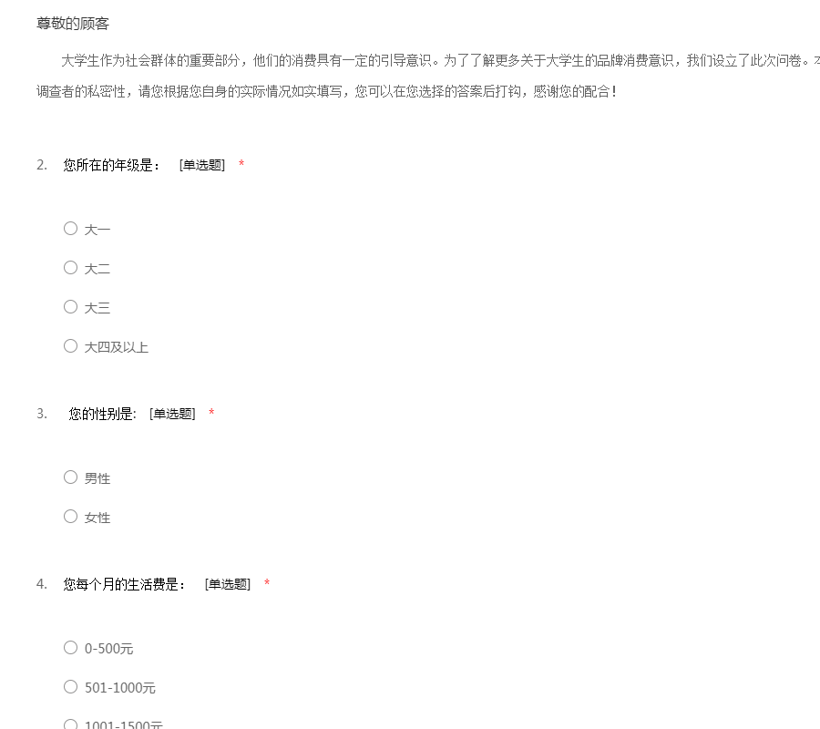 大学生作为社会群体的重要部分,他们的消费具有一定的引导意识。为了了解更多关于大学生的品牌消费意识,我们设立了此次问卷。本问卷将采取不记名的调查方式来保证被调查者的私密性,请您根据您自身的实际情况如实填写,您可以在您选择的答案后打钩,感谢您的配合!