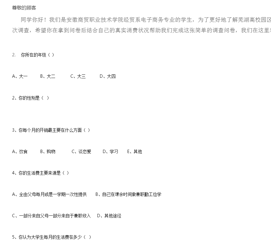 同学你好!我们是安徽商贸职业技术学院经贸系电子商务专业的学生,为了更好地了解芜湖高校园区大学生的消费状况我们进行此次调查,希望你在拿到问卷后结合自己的真实消费状况帮助我们完成这张简单的调查问卷,我们在这里表示感谢!