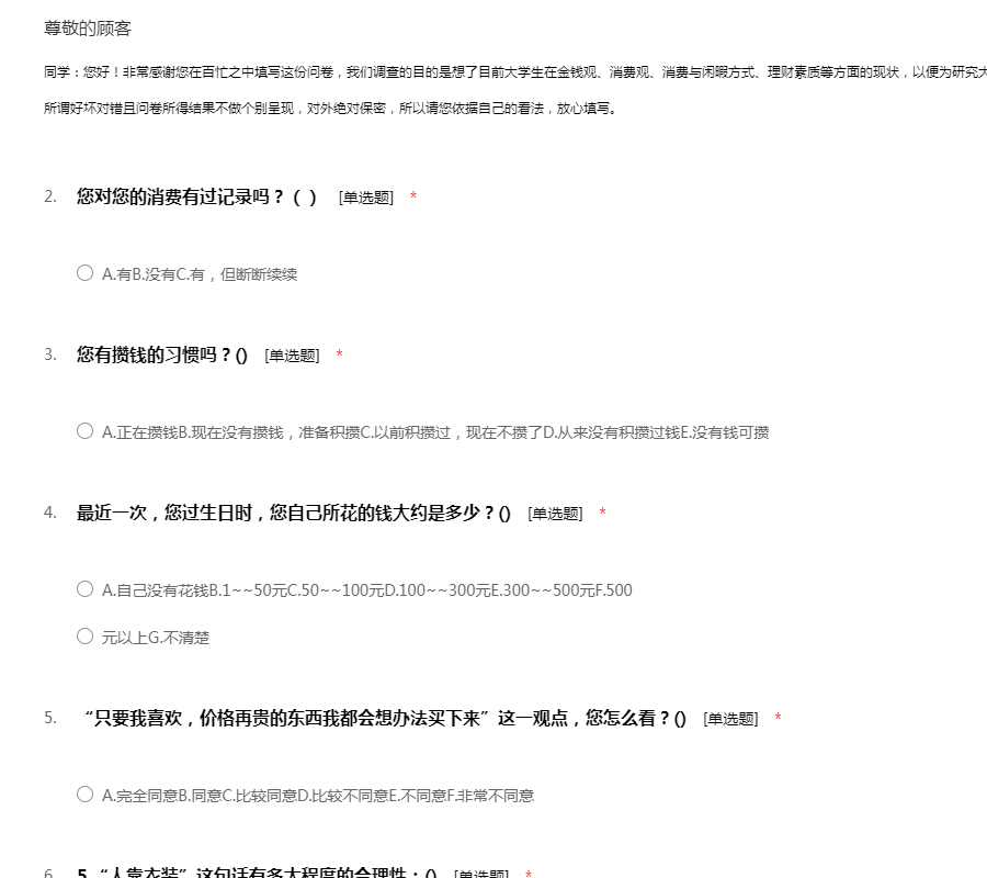 同学:您好!非常感谢您在百忙之中填写这份问卷,我们调查的目的是想了目前大学生在金钱观、消费观、消费与闲暇方式、理财素质等方面的现状,以便为研究大学生时尚消费提供更多依据。本问卷各项答案无所谓好坏对错且问卷所得结果不做个别呈现,对外绝对保密,所以请您依据自己的看法,放心填写。
