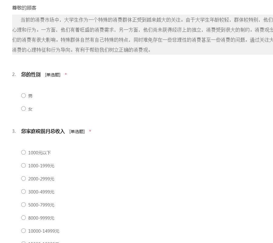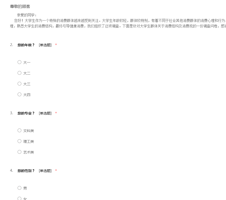 亲爱的同学: 您好!大学生作为一个特殊的消费群体越来越受到关注。大学生年龄较轻,群体较特别,有着不同于社会其他消费群体的消费心理和行为。为了进一步了解在校大学生的消费心理,熟悉大学生的消费结构,最终引导健康消费,我们组织了这项调查。下面是针对大学生群体关于消费结构及消费观的一份调查问卷,感谢同学们拿出自己的宝贵时间积极参与!