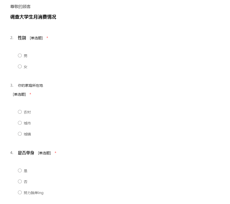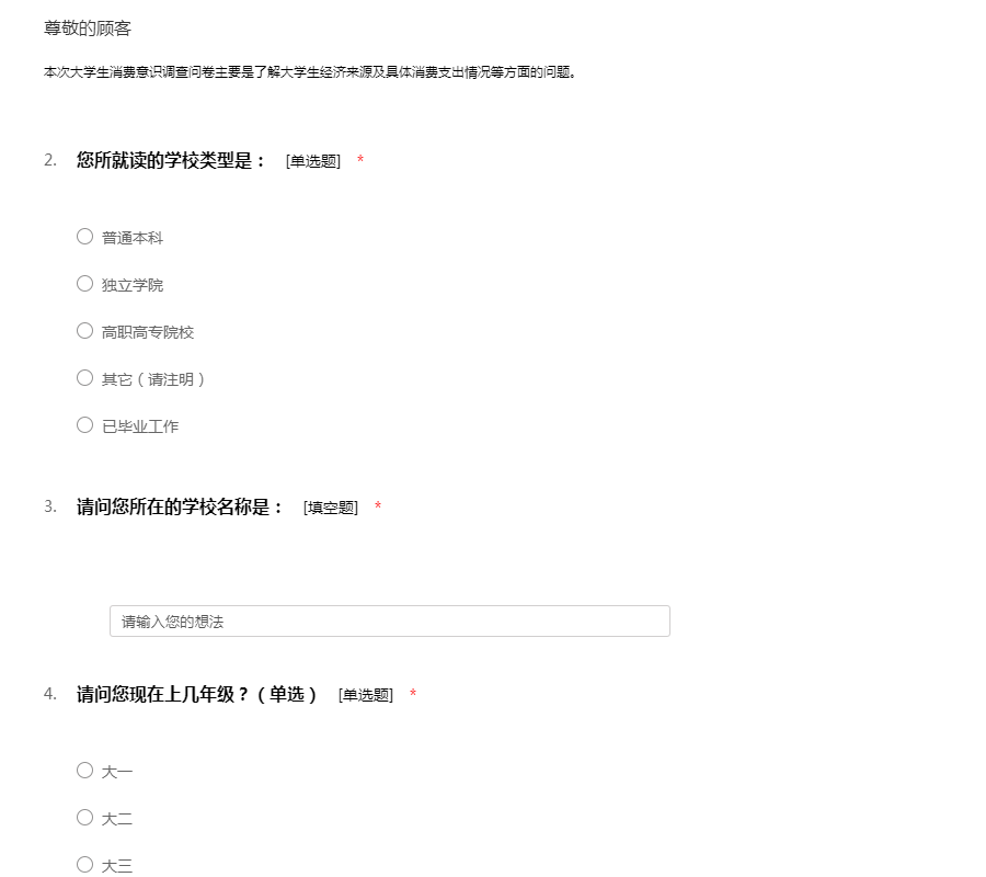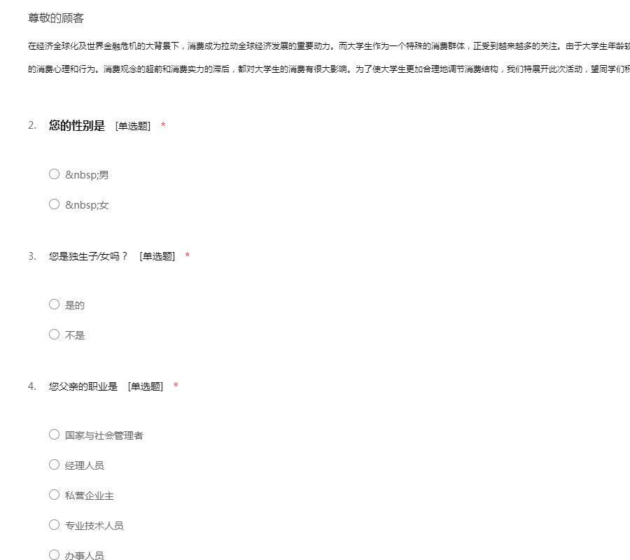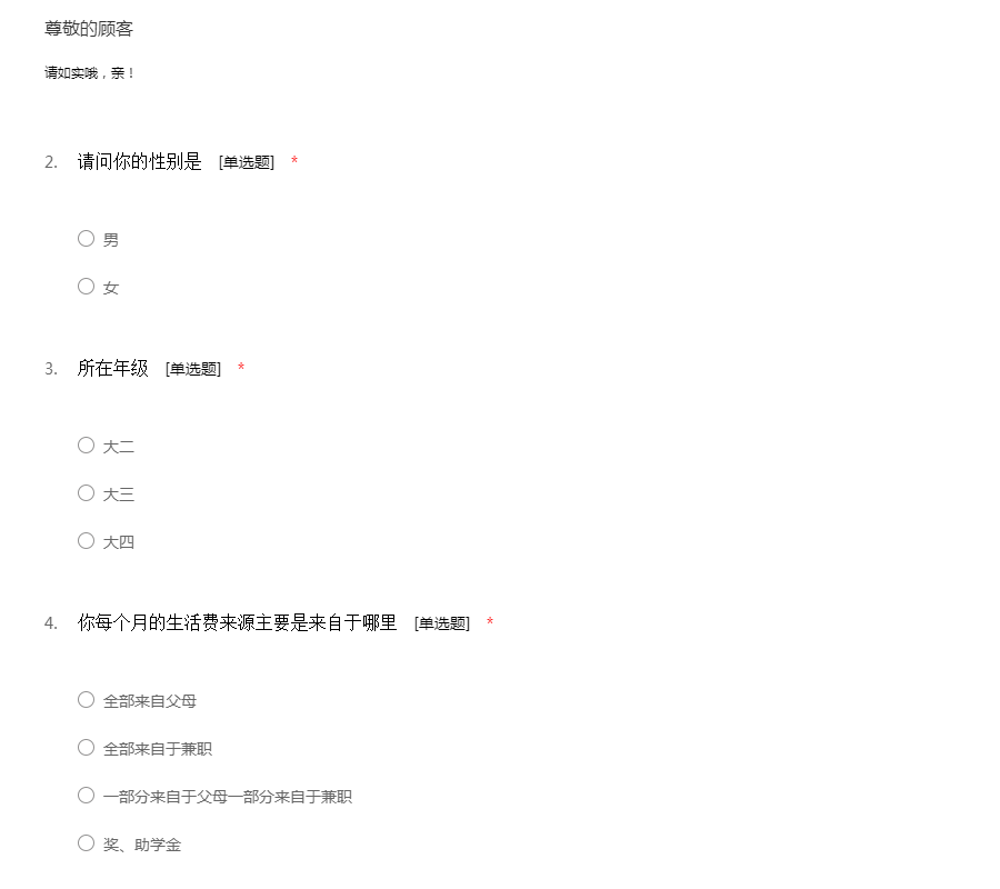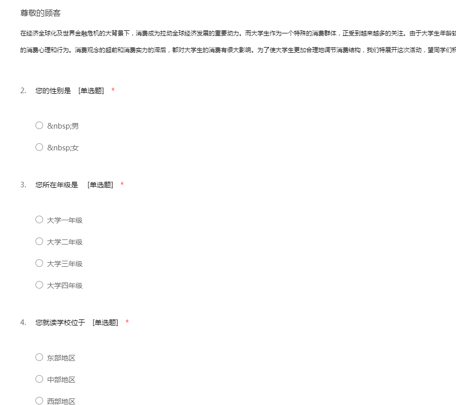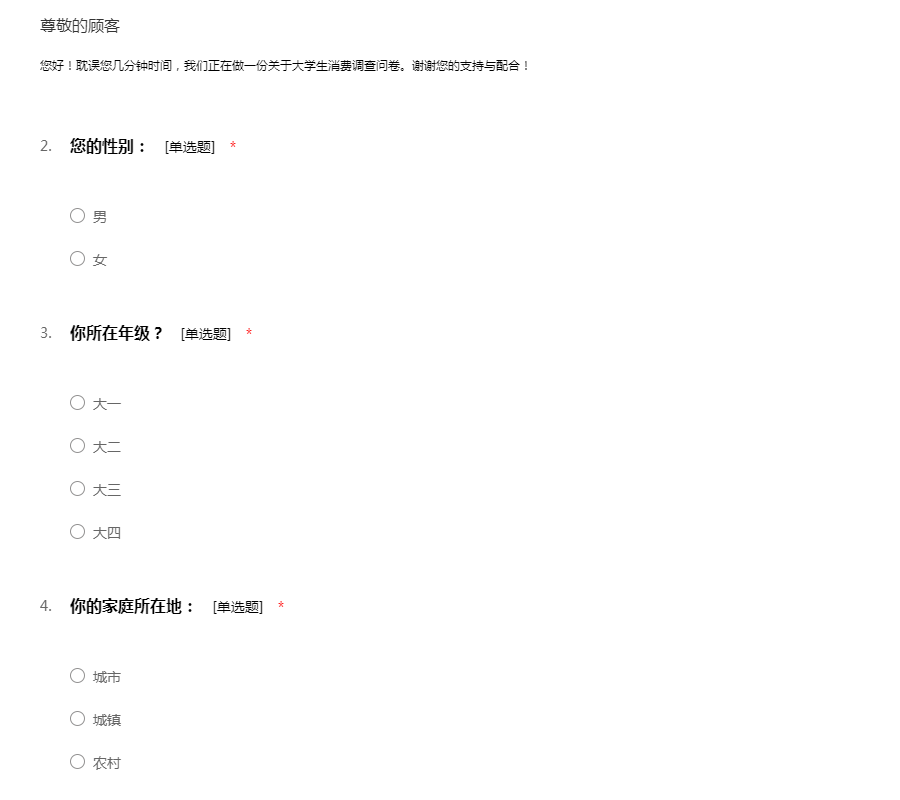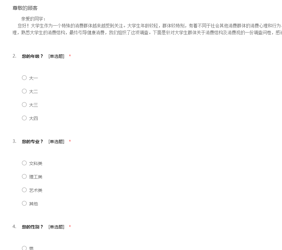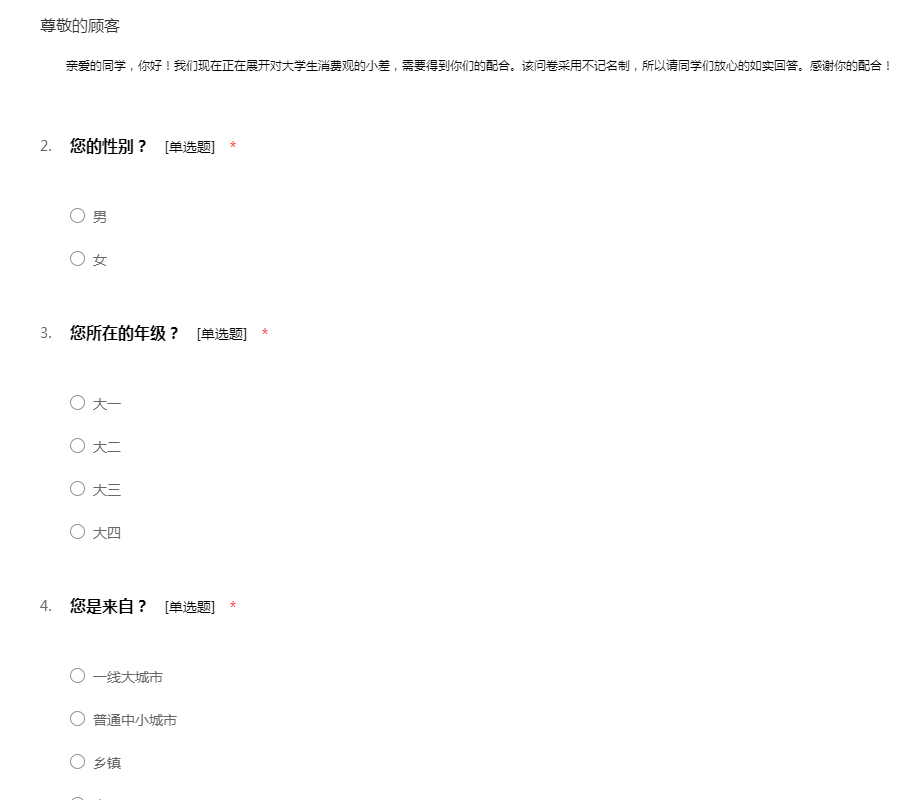 ——亲爱的同学,你好!我们现在正在展开对大学生消费观的小差,需要得到你们的配合。该问卷采用不记名制,所以请同学们放心的如实回答。感谢你的配合!