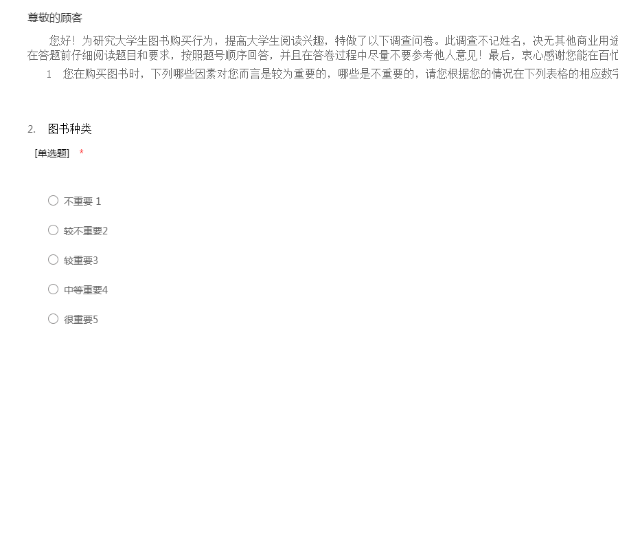 您好!为研究大学生图书购买行为,提高大学生阅读兴趣,特做了以下调查问卷。此调查不记姓名,决无其他商业用途,您在填表时不要有任何顾虑。请在答题前仔细阅读题目和要求,按照题号顺序回答,并且在答卷过程中尽量不要参考他人意见!最后,衷心感谢您能在百忙之中提供宝贵的信息,谢谢! 1 您在购买图书时,下列哪些因素对您而言是较为重要的,哪些是不重要的,请您根据您的情况在下列表格的相应数字位置打钩。