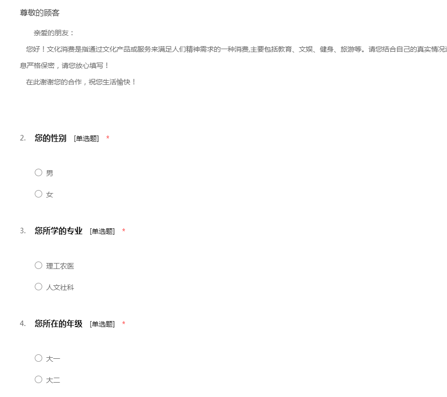 亲爱的朋友: 您好!文化消费是指通过文化产品或服务来满足人们精神需求的一种消费,主要包括教育、文娱、健身、旅游等。请您结合自己的真实情况选择相应的选项。我们将会对您的相关信息严格保密,请您放心填写! 在此谢谢您的合作,祝您生活愉快!