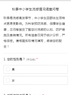 秋季是流感高发季节,中小学生因群体生活特点更易受影响。为科学预防流感、保障学生健康,本问卷旨在了解您对流感的认知、防护措施及患病情况。所有信息仅用于统计分析,严格保密。请根据实际情况填写,感谢您的配合!