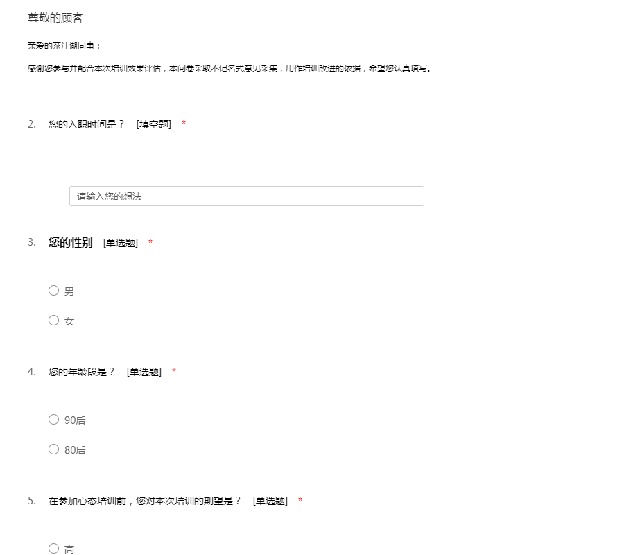 亲爱的茶江湖同事:感谢您参与并配合本次培训效果评估,本问卷采取不记名式意见采集,用作培训改进的依据,希望您认真填写。