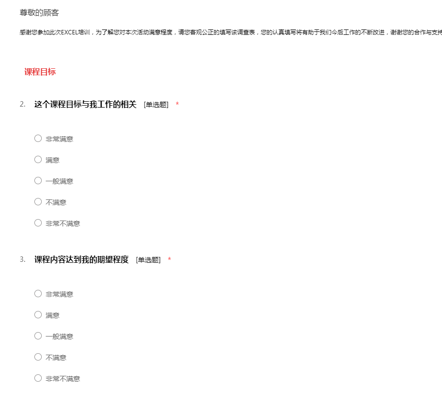 感谢您参加此次EXCEL培训,为了解您对本次活动满意程度,请您客观公正的填写该调查表,您的认真填写将有助于我们今后工作的不断改进,谢谢您的合作与支持!