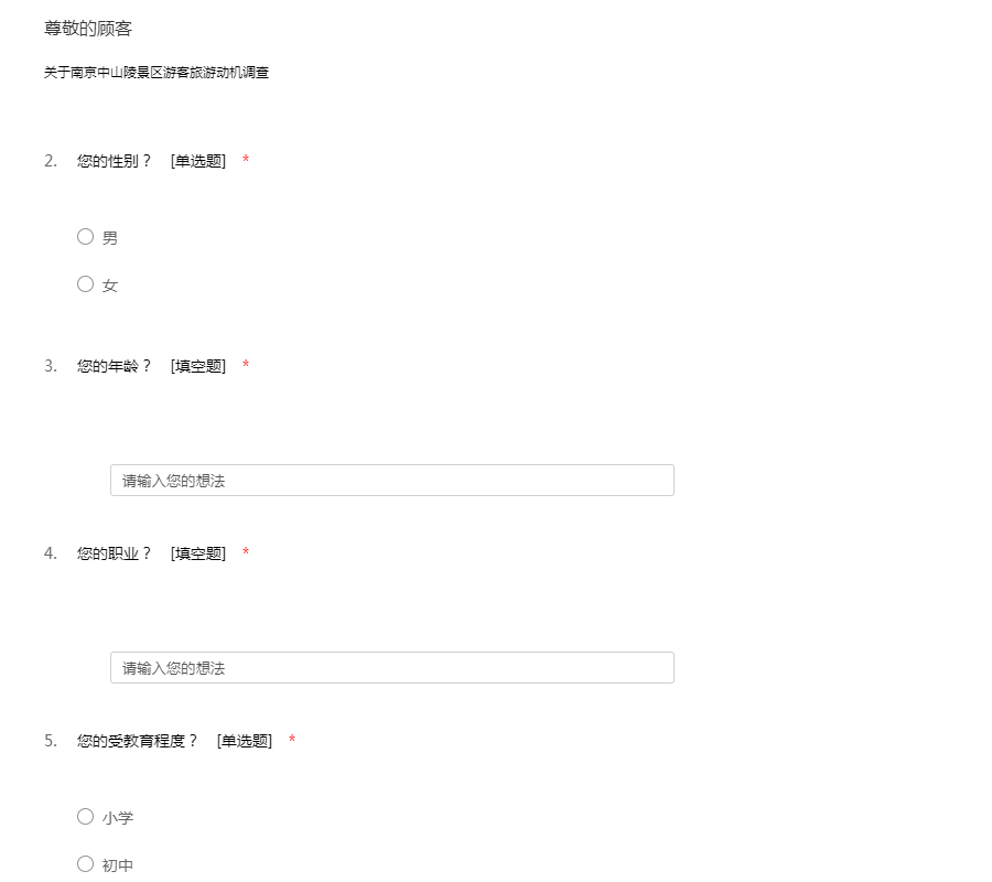 我们是三江学院旅游管理专业大一学生,正在进行夫子庙景区游客旅游动机调查研究,希望您能协助我们回答问卷调查的问题,以便我们的研究,结果也仅仅用于本次调查研究,回答仅需两分钟,您的答案对我们非常重要,我们将表示万分感谢!