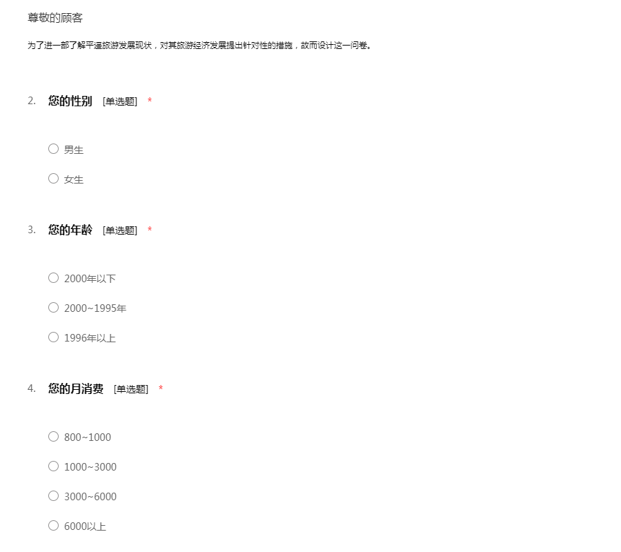 为了进一部了解平遥旅游发展现状,对其旅游经济发展提出针对性的措施,故而设计这一问卷。