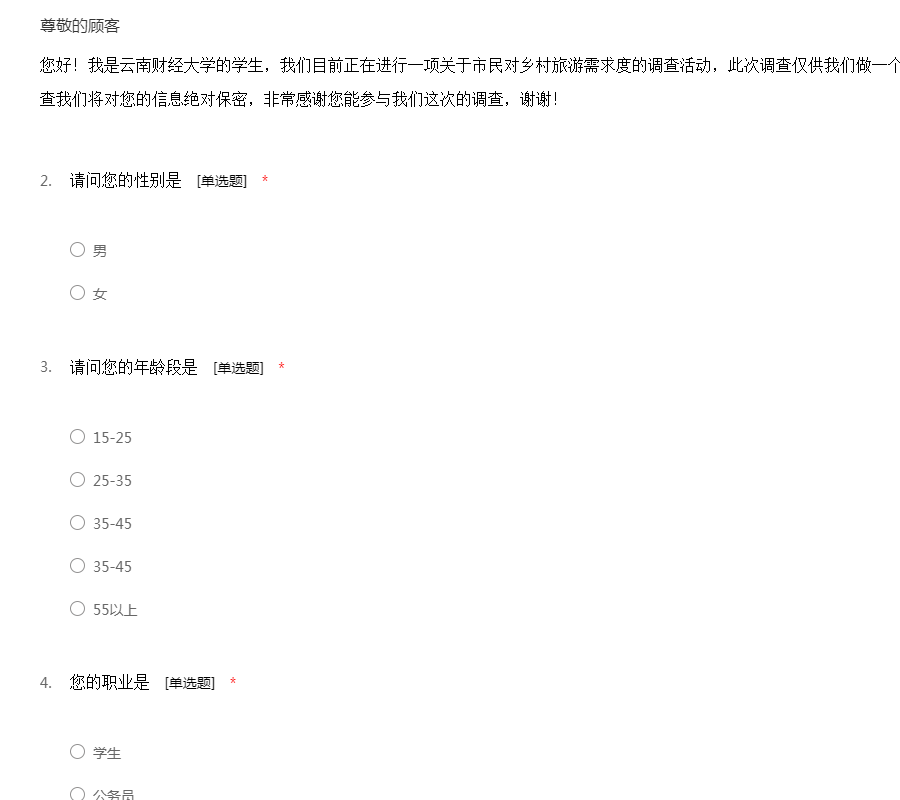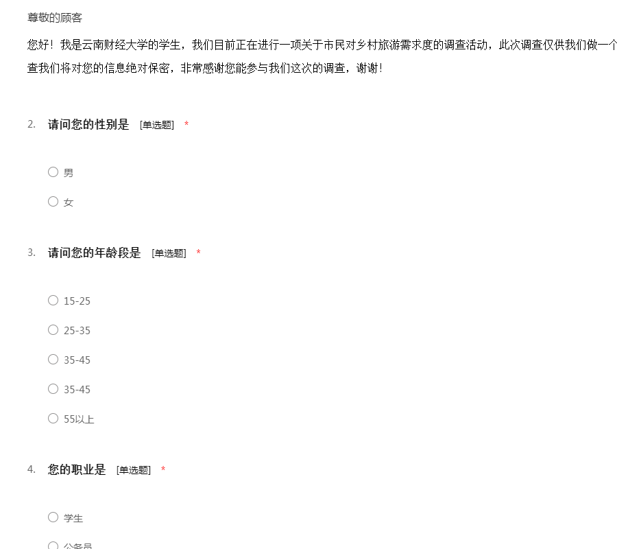 您好!我是云南财经大学的学生,我们目前正在进行一项关于市民对乡村旅游需求度的调查活动,此次调查仅供我们做一个乡村旅游发展方面的研究,这项调查我们将对您的信息绝对保密,非常感谢您能参与我们这次的调查,谢谢!