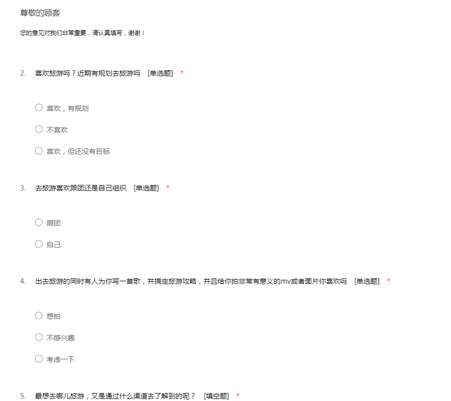 这份大学生旅游问卷调查是为了调查目前大学生的旅游消费习惯,想邀请您用几分钟时间帮忙填答这份问卷。您的真实回答对我们来说十分宝贵!感谢您在百忙之中回答此卷!51调查网(我要调查网)谢谢您的参与。