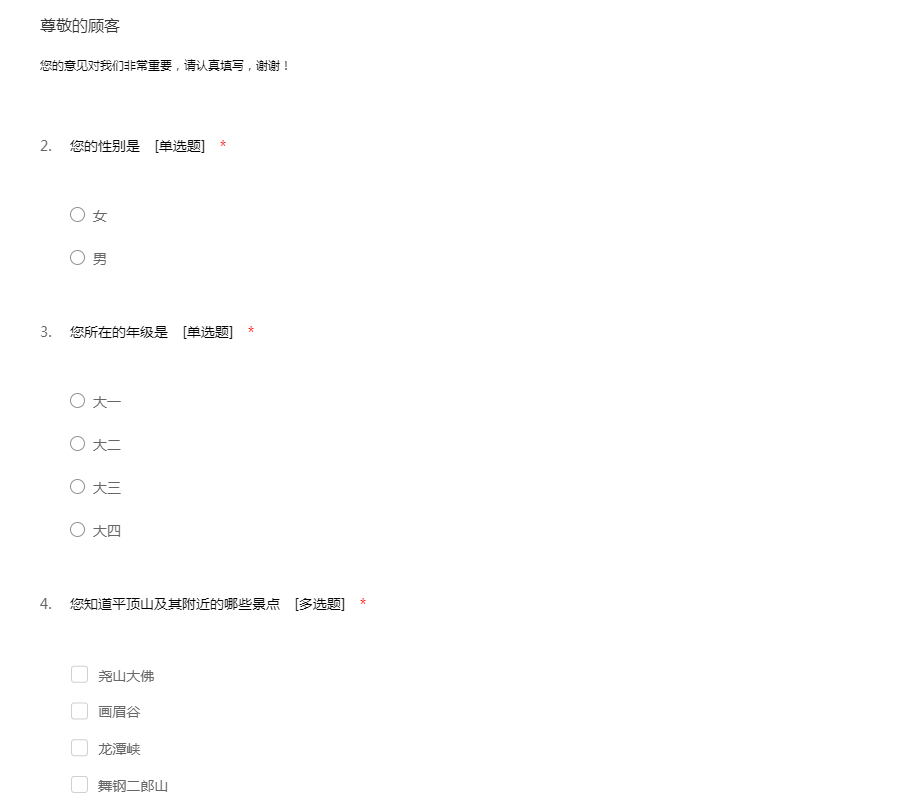 你好!为了了解大学生对红色旅游的看法,我们准备了此次问卷调查,你的回答对我们的调查结果非常重要,此次调查不需填写姓名,答案无对错之分,请不必有任何顾虑。衷心感谢你的配合,祝你学习进步,生活愉快!