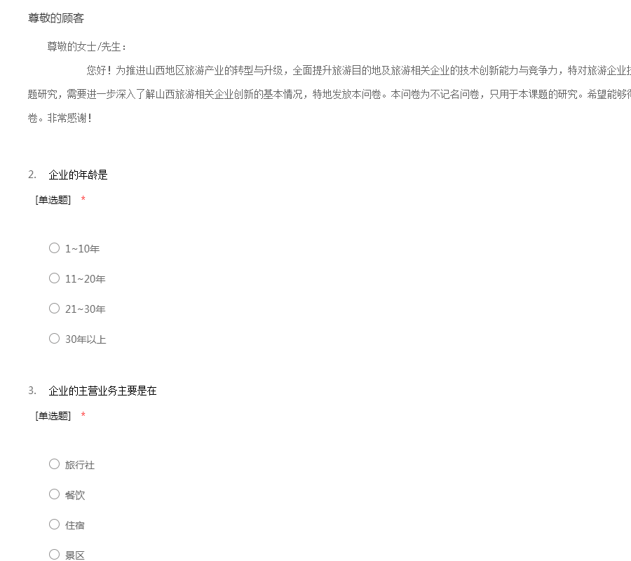 尊敬的女士/先生: 您好!为推进山西地区旅游产业的转型与升级,全面提升旅游目的地及旅游相关企业的技术创新能力与竞争力,特对旅游企业技术创新动力进行研究。为了做好本次专题研究,需要进一步深入了解山西旅游相关企业创新的基本情况,特地发放本问卷。本问卷为不记名问卷,只用于本课题的研究。希望能够得到您的大力支持与合作,完成本次问卷。非常感谢!