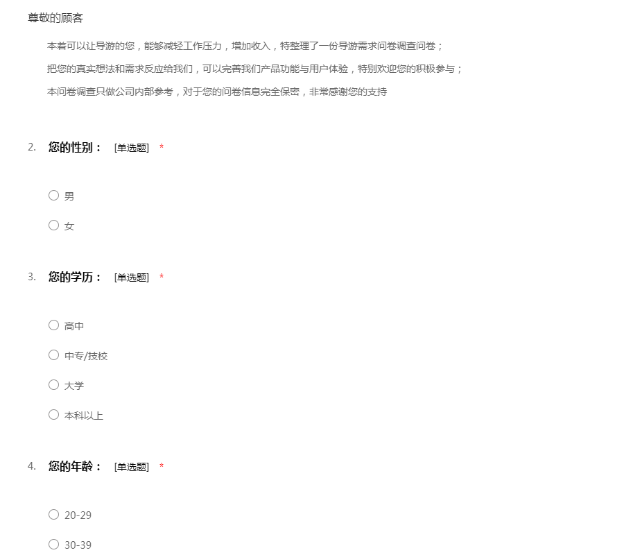 本着可以让导游的您,能够减轻工作压力,增加收入,特整理了一份导游需求问卷调查问卷; 把您的真实想法和需求反应给我们,可以完善我们产品功能与用户体验,特别欢迎您的积极参与; 本问卷调查只做公司内部参考,对于您的问卷信息完全保密,非常感谢您的支持