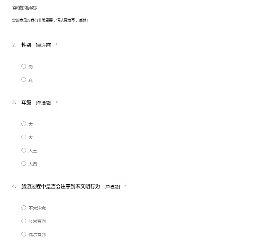 亲爱的同学:您好!为了了解大学生旅游态势现状,我们正在网上调查。非常感谢您能够作为其中一员参加调查,提供您的看法和意见,希望得到您的合作。本调查不记名,请放心填写。能得到您宝贵的意见,我们十分荣幸。谢谢!