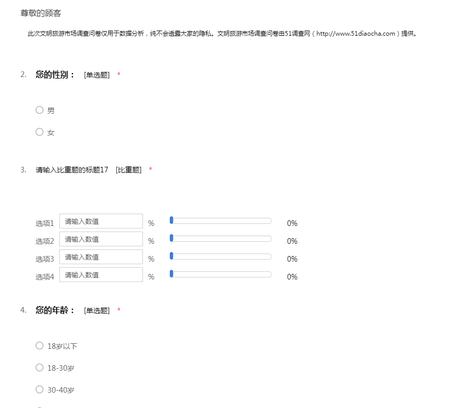 此次文明旅游市场调查问卷仅用于数据分析,纯不会透露大家的隐私。文明旅游市场调查问卷由51调查网(http://www.51diaocha.com)提供。