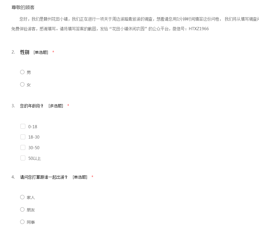 您好,我们是赣州花田小镇,我们正在进行一项关于周边游踏青旅游的调查,想邀请您用1分钟时间填答这份问卷, 我们将从填写调查问题的朋友当中,抽取20位朋友当我们的免费体验游客,感谢填写。请将填写答案的截图,发给“花田小镇休闲农园”的公众平台,微信号:HTXZ1966