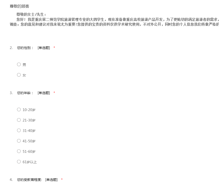 尊敬的女士/先生: 您好! 我是重庆第二师范学院旅游管理专业的大四学生,现在准备做重庆高校旅游产品开发,为了更贴切的满足旅游者的需求,提出合理的发展规划,特别展开这次调查。您的意见和建议对我来说尤为重要!您提供的宝贵的资料仅供学术研究使用,不对外公开,同时您的个人信息我们将做严格的保密。衷心地感谢您的支持与配合!