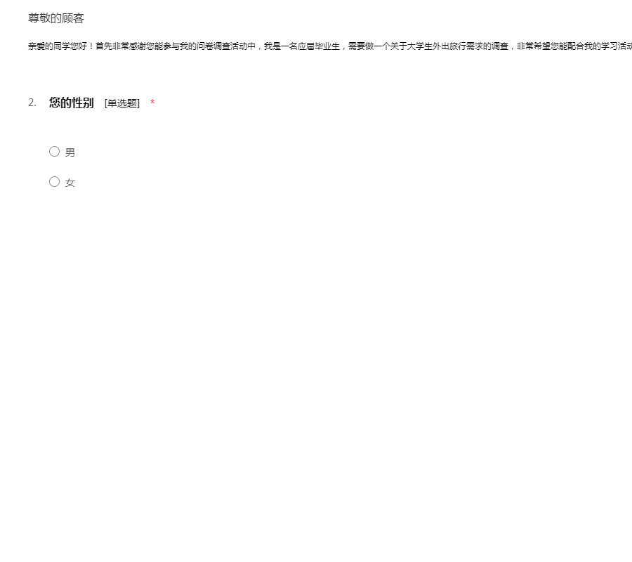 亲爱的同学您好!首先非常感谢您能参与我的问卷调查活动中,我是一名应届毕业生,需要做一个关于大学生外出旅行需求的调查,非常希望您能配合我的学习活动。