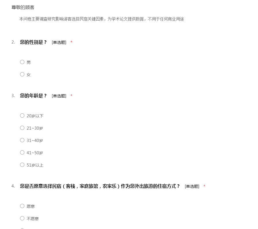 本问卷主要调查研究影响游客选择民宿关键因素,为学术论文提供数据,不用于任何商业用途