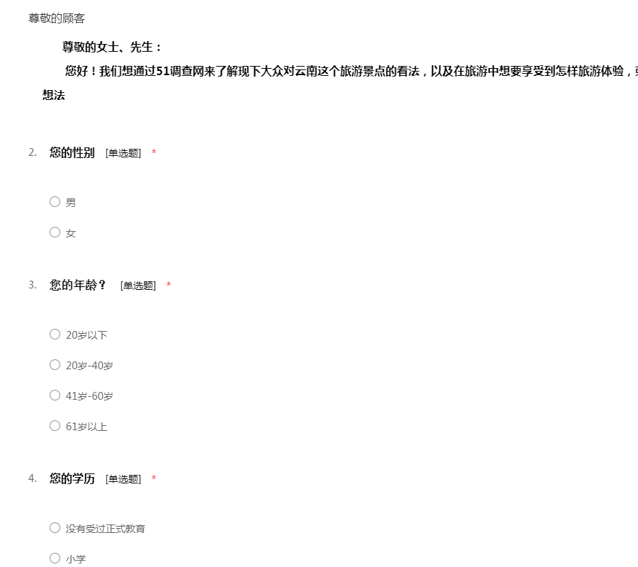尊敬的女士、先生: 您好!我们想通过51调查网来了解现下大众对云南这个旅游景点的看法,以及在旅游中想要享受到怎样旅游体验,或者有更好的有关于云南旅游路线的想法
