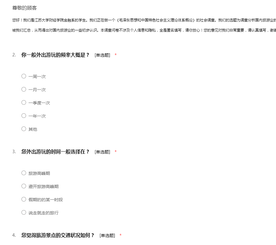 您好!我们是江苏大学财经学院金融系的学生。我们正在做一个《毛泽东思想和中国特色社会主义理论体系概论》的社会调查。我们的选题为调查分析国内旅游业的现状,需要您的配合。您对我们问卷的回答将会被我们汇总,从而得出对国内旅游业的一些初步认识。本调查问卷不涉及个人信息和隐私,全是匿名填写,请你放心!您的意见对我们非常重要,请认真填写,谢谢!