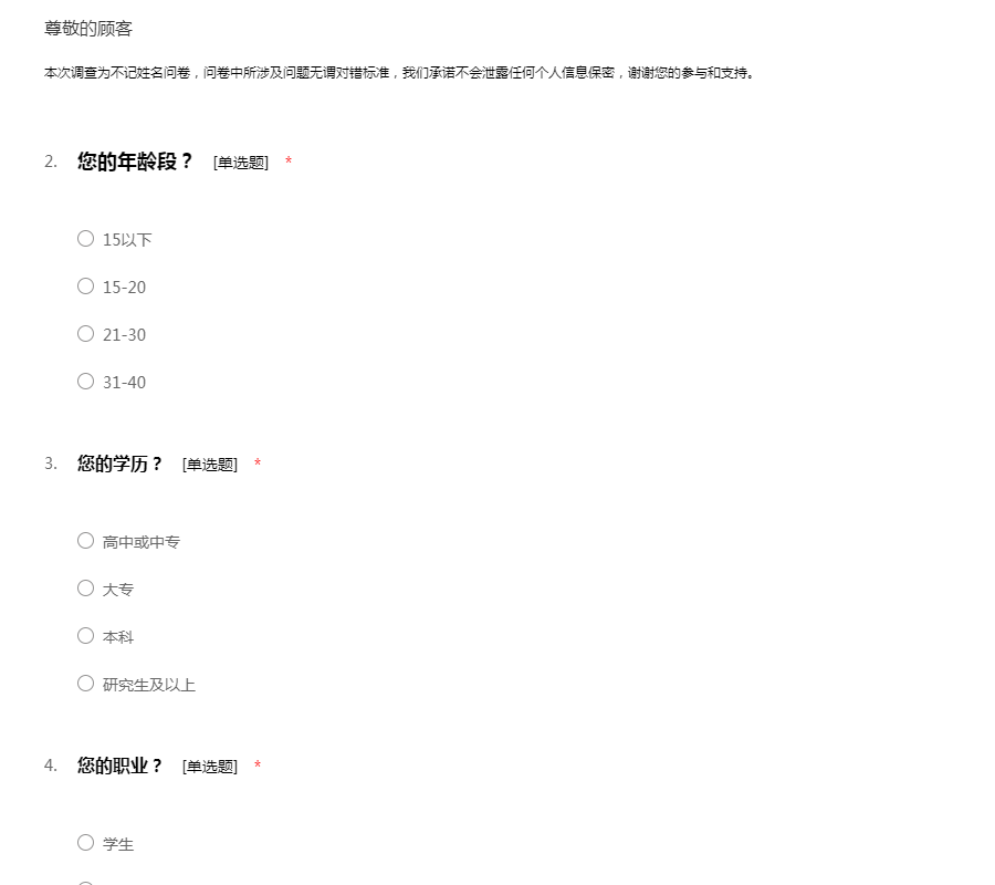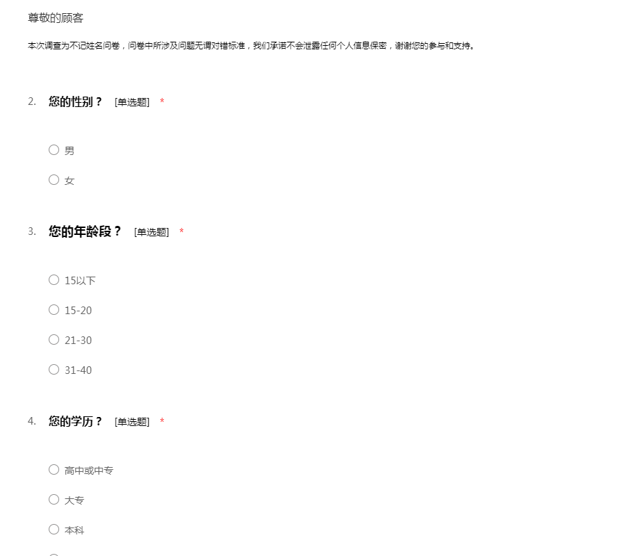 本次调查为不记姓名问卷,问卷中所涉及问题无谓对错标准,我们承诺不会泄露任何个人信息保密,谢谢您的参与和支持。