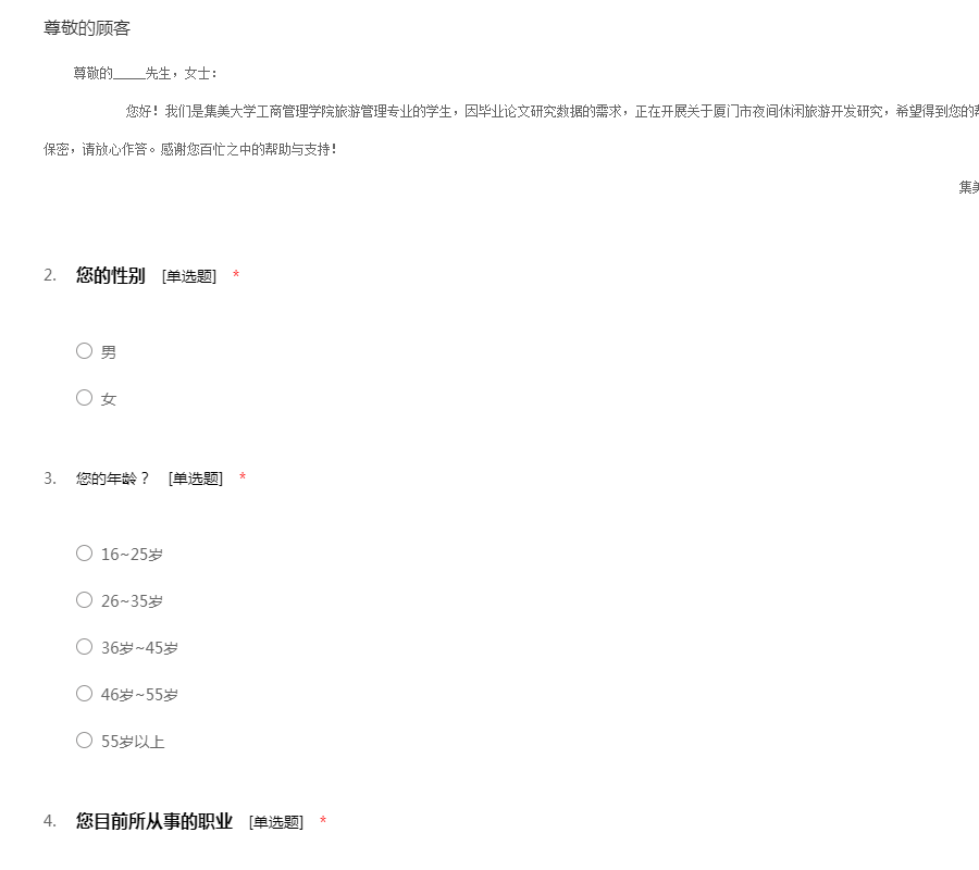 尊敬的_____先生,女士: 您好!我们是集美大学工商管理学院旅游管理专业的学生,因毕业论文研究数据的需求,正在开展关于厦门市夜间休闲旅游开发研究,希望得到您的帮助。问卷无需署名,您的个人信息将得到完全保密,请放心作答。感谢您百忙之中的帮助与支持!集美大学工商管理学院旅游管理专业 2016年9月