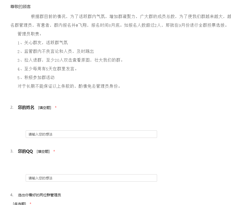 根据群目前的情况,为了活跃群内气氛,增加群凝聚力,广大群的成员总数,为了使我们群越来越大,越来越和谐,面向所有群成员招聘两名群管理员,有意者,群内报名并@飞翔,报名时间8月底。如报名人数超过2人,那就在9月份进行全群投票选拔。