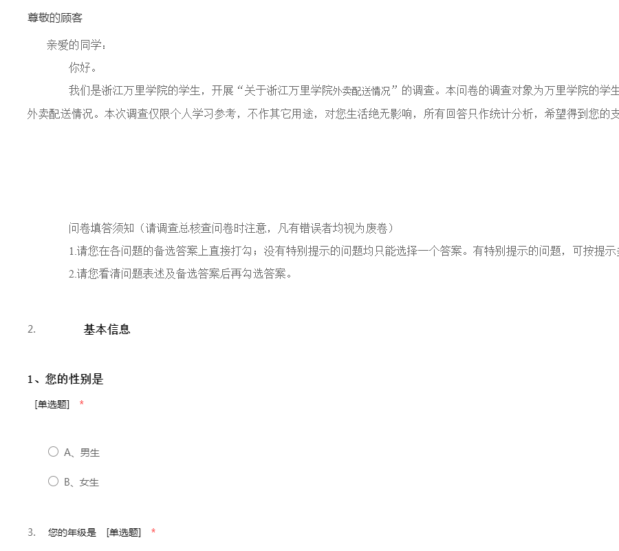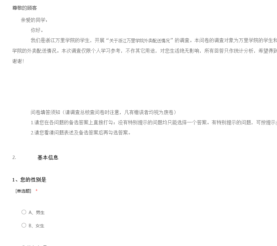 我们是浙江万里学院的学生,开展“关于浙江万里学院外卖配送情况”的调查。本问卷的调查对象为万里学院的学生和餐饮店,调查目的是了解浙江万里学院的外卖配送情况。本次调查仅限个人学习参考,不作其它用途,对您生活绝无影响,所有回答只作统计分析,希望得到您的支持与协助!感谢您的配合!谢谢!