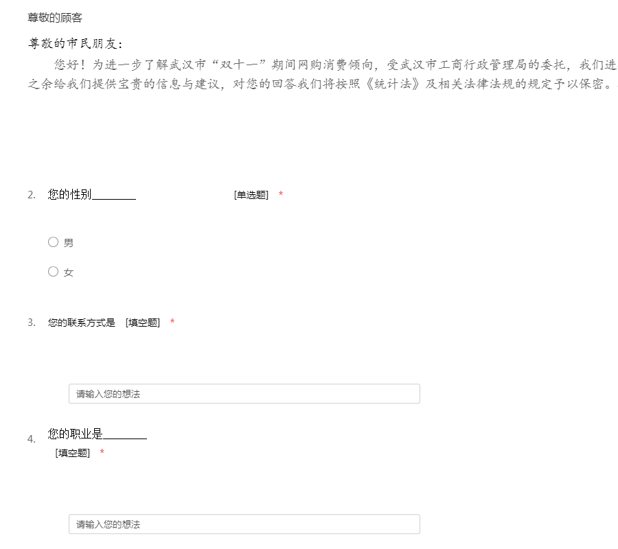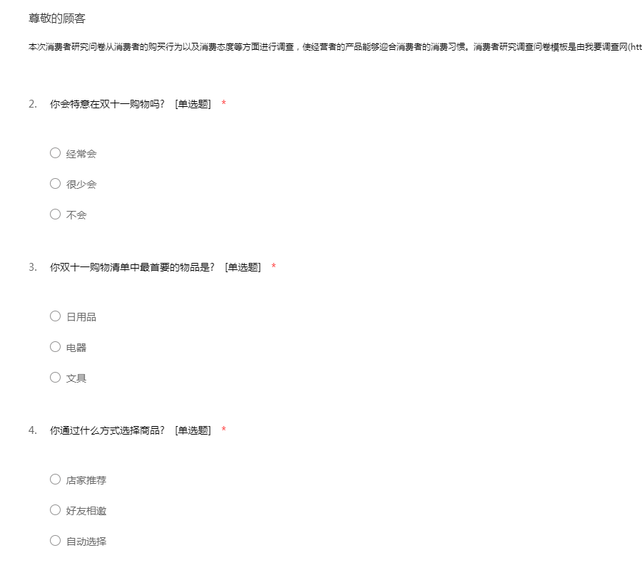 感谢您参与“双十一网购调查问卷”,此次调查旨在了解电商双十一消费的情况,调查所得的结果对您的工作和生活不会带来任何不良影响,请您根据自己的实际情况放心填写,51调查网感谢您的配合!