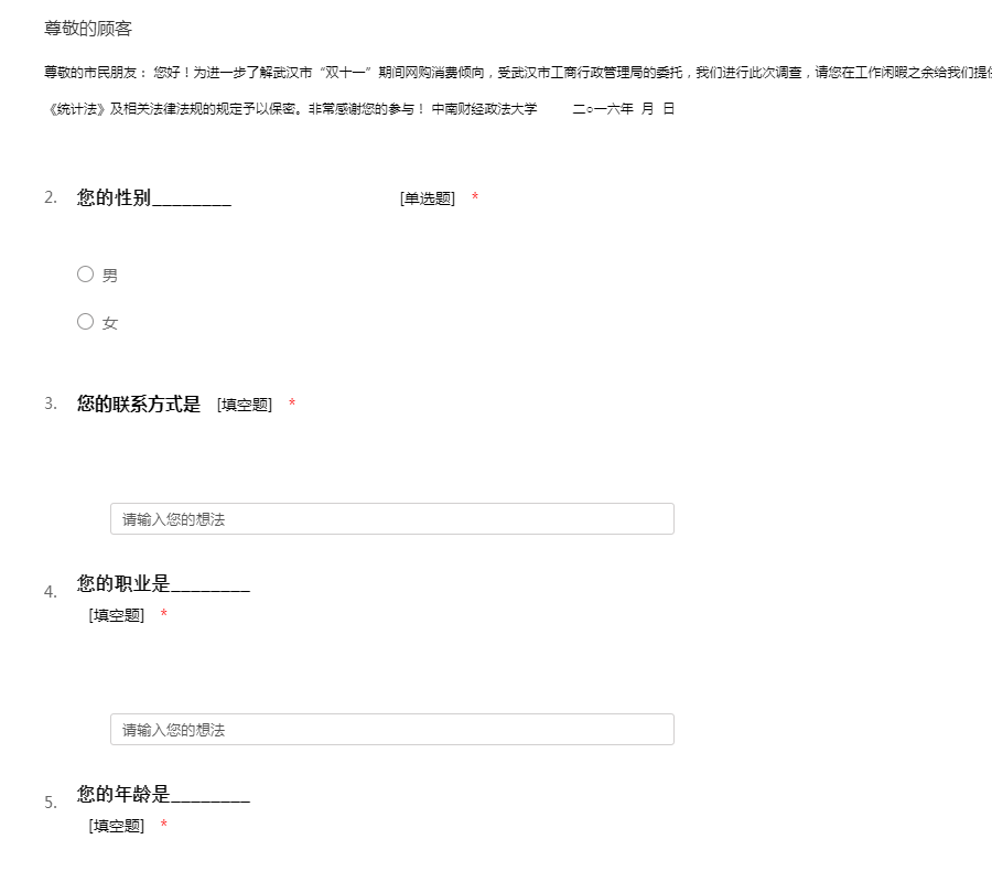 尊敬的市民朋友: 您好!为进一步了解武汉市“双十一”期间网购消费倾向,受武汉市工商行政管理局的委托,我们进行此次调查,请您在工作闲暇之余给我们提供宝贵的信息与建议,对您的回答我们将按照《统计法》及相关法律法规的规定予以保密。非常感谢您的参与! 中南财经政法大学 二○一六年 月 日