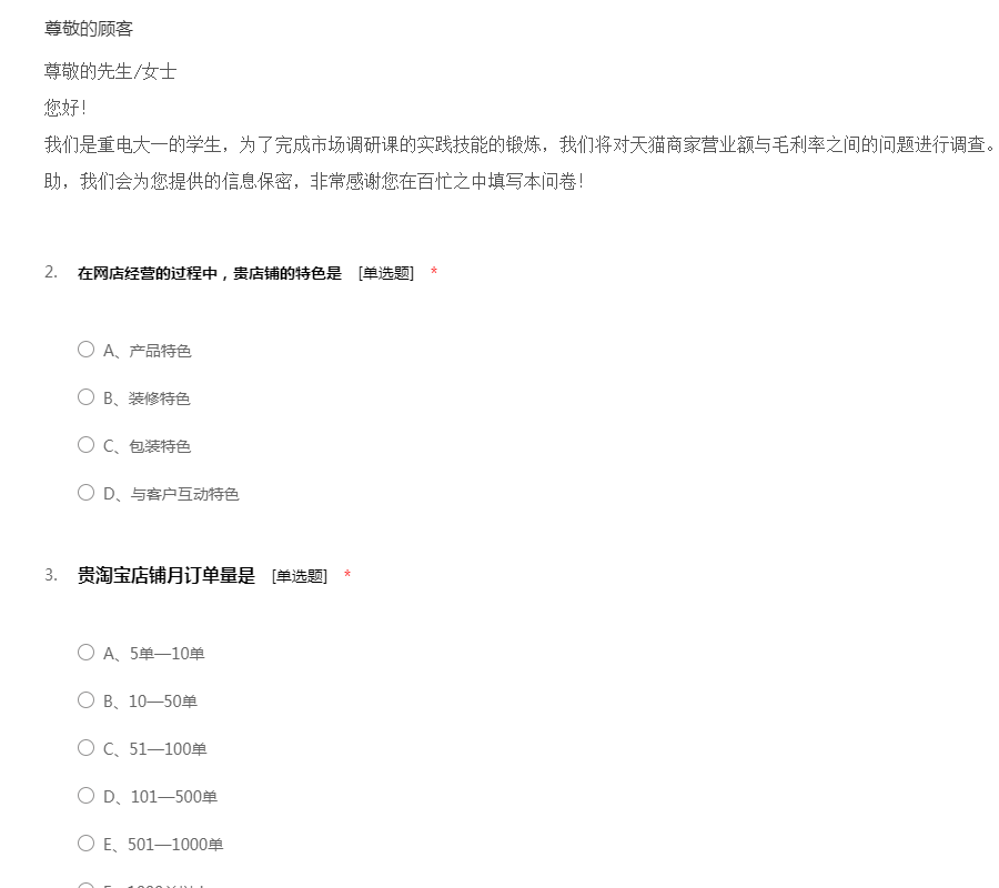 尊敬的先生/女士 您好! 我们是重电大一的学生,为了完成市场调研课的实践技能的锻炼,我们将对天猫商家营业额与毛利率之间的问题进行调查。在此,期望能得到您的支持和帮助,我们会为您提供的信息保密,非常感谢您在百忙之中填写本问卷!