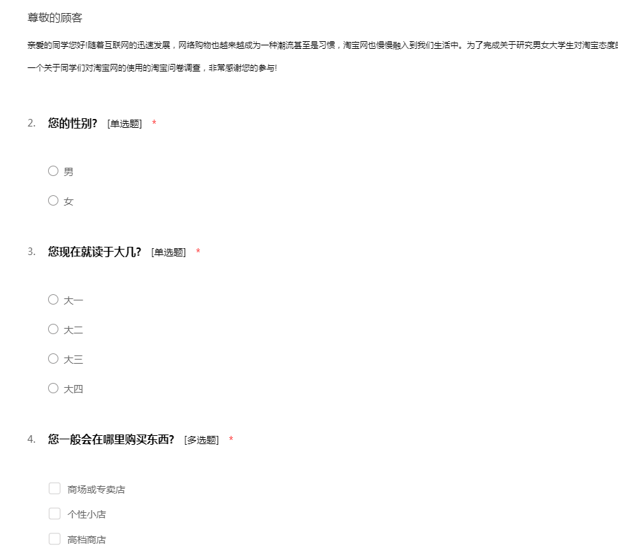 尊敬的先生/女士:您好!非常感谢您参与本次答卷!我们正在进行一项有关淘宝店铺的小调查。您的观点和意见会被严格保密,最终仅被用于汇总后的统计分析,请您放心填写。