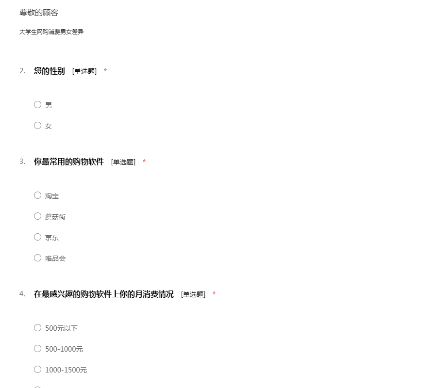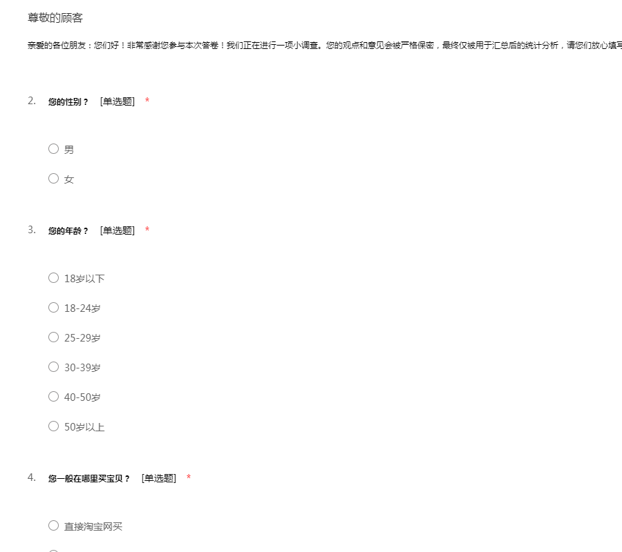 尊敬的先生/女士:您好!非常感谢您参与本次答卷!我们正在进行一项有关淘宝店铺的小调查。您的观点和意见会被严格保密,最终仅被用于汇总后的统计分析,请您放心填写。