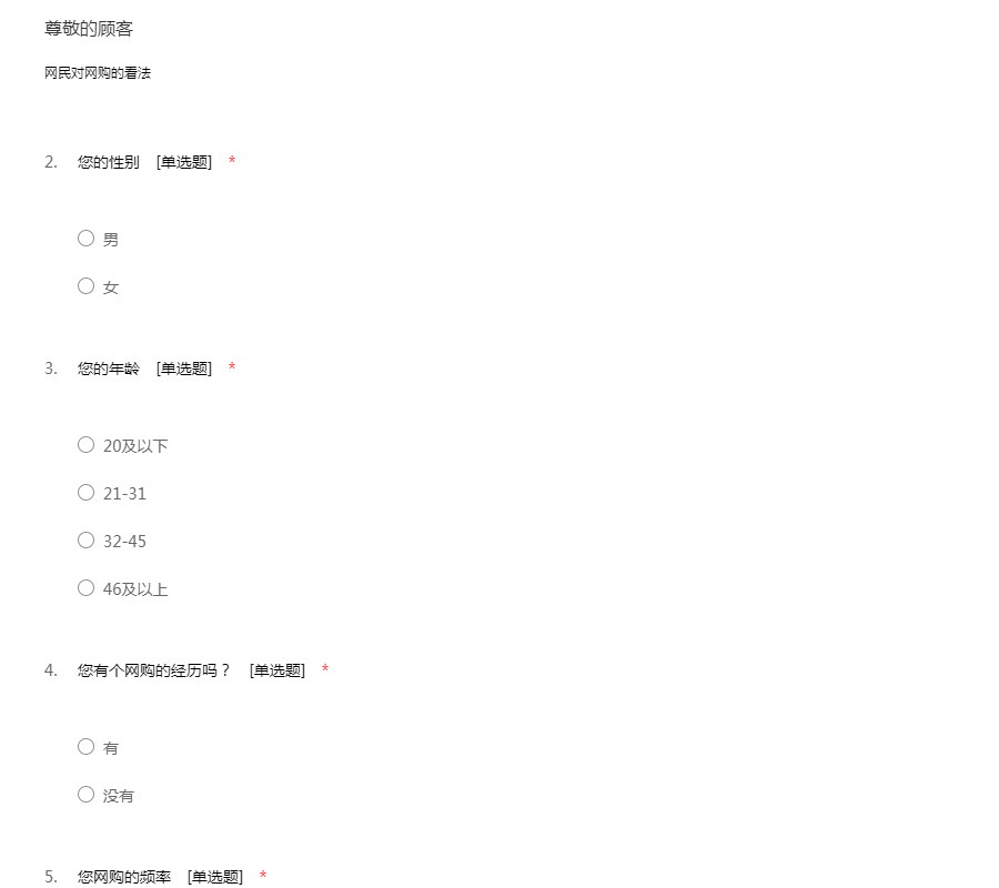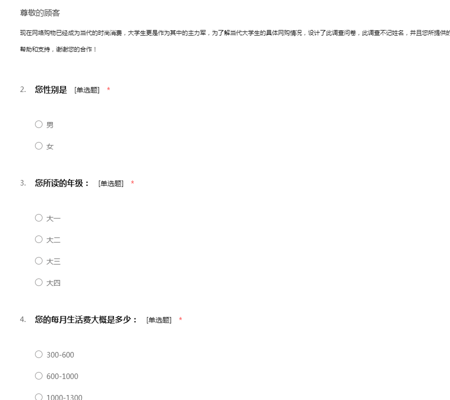 您好,耽误您几分钟时间,很感谢您能在百忙之中接受我们的调查,此次调查是关于网络购物调查问卷,很感谢您的支持与理解回答下面的几个问题