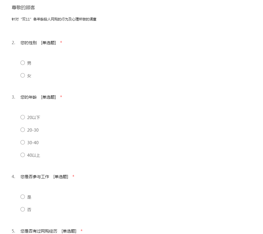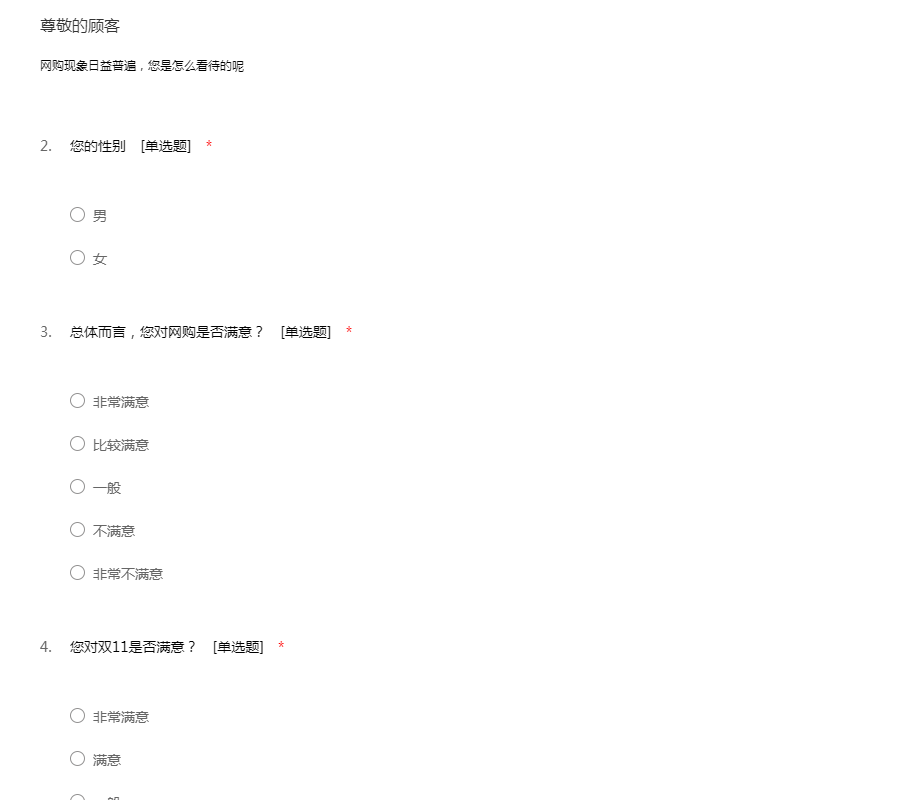 我们在做有关“双十一”购物狂欢节网购情况的调查,特进行此次问卷调查,望您能在百忙之中抽出一点宝贵时间协助我们完成以下调查问卷。51调查网(我要调查网)谢谢您的参与。