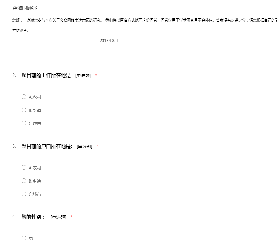 您好: 谢谢您参与本次关于公众网络表达意愿的研究。 我们将以匿名方式处理这份问卷,问卷仅用于学术研究且不会外传。答案没有对错之分,请您根据自己的真实情况进行回答。最后感谢您于百忙之中参与本次调查。 2017年3月