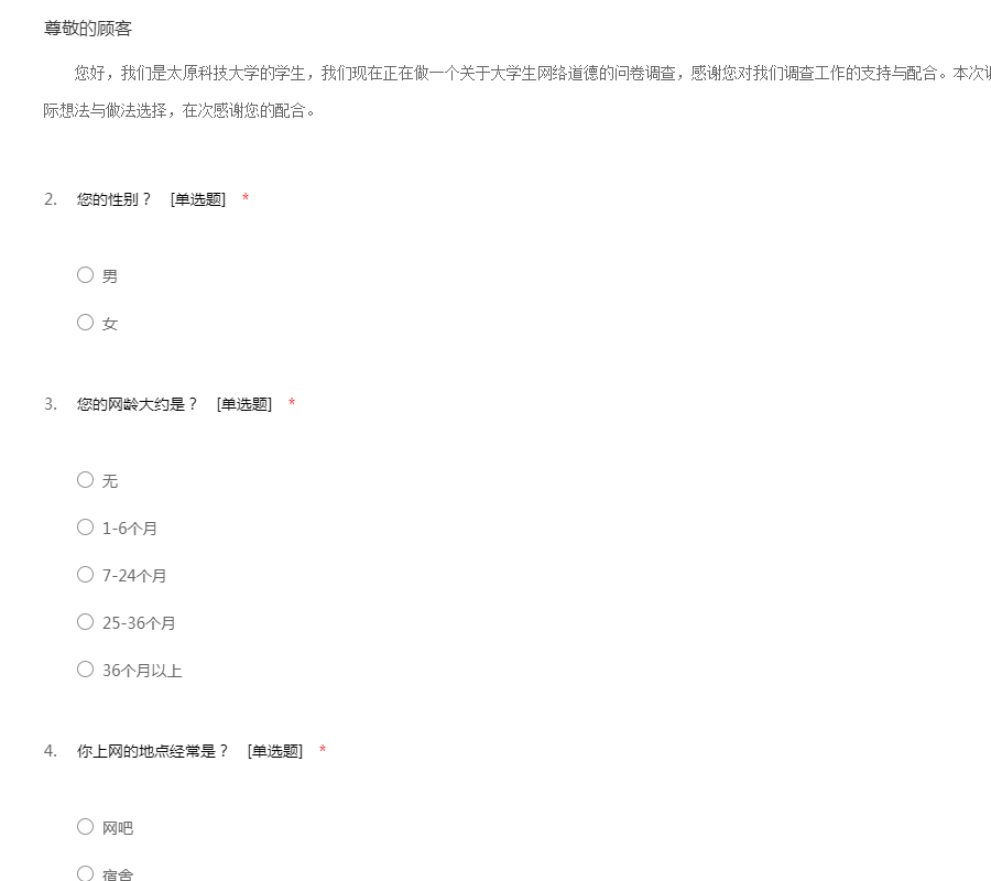 您好,我们是太原科技大学的学生,我们现在正在做一个关于大学生网络道德的问卷调查,感谢您对我们调查工作的支持与配合。本次调查采取无记名的方式,请您根据您的实际想法与做法选择,在次感谢您的配合。