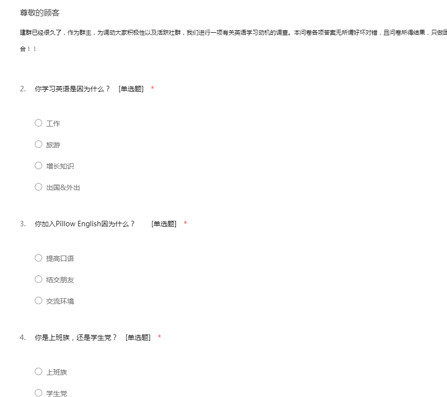 建群已经很久了,作为群主,为调动大家积极性以及活跃社群,我们进行一项有关英语学习动机的调查。本问卷各项答案无所谓好坏对错,且问卷所得结果,只做团体性的分析,请大家务必认真答题,谢谢配合!!